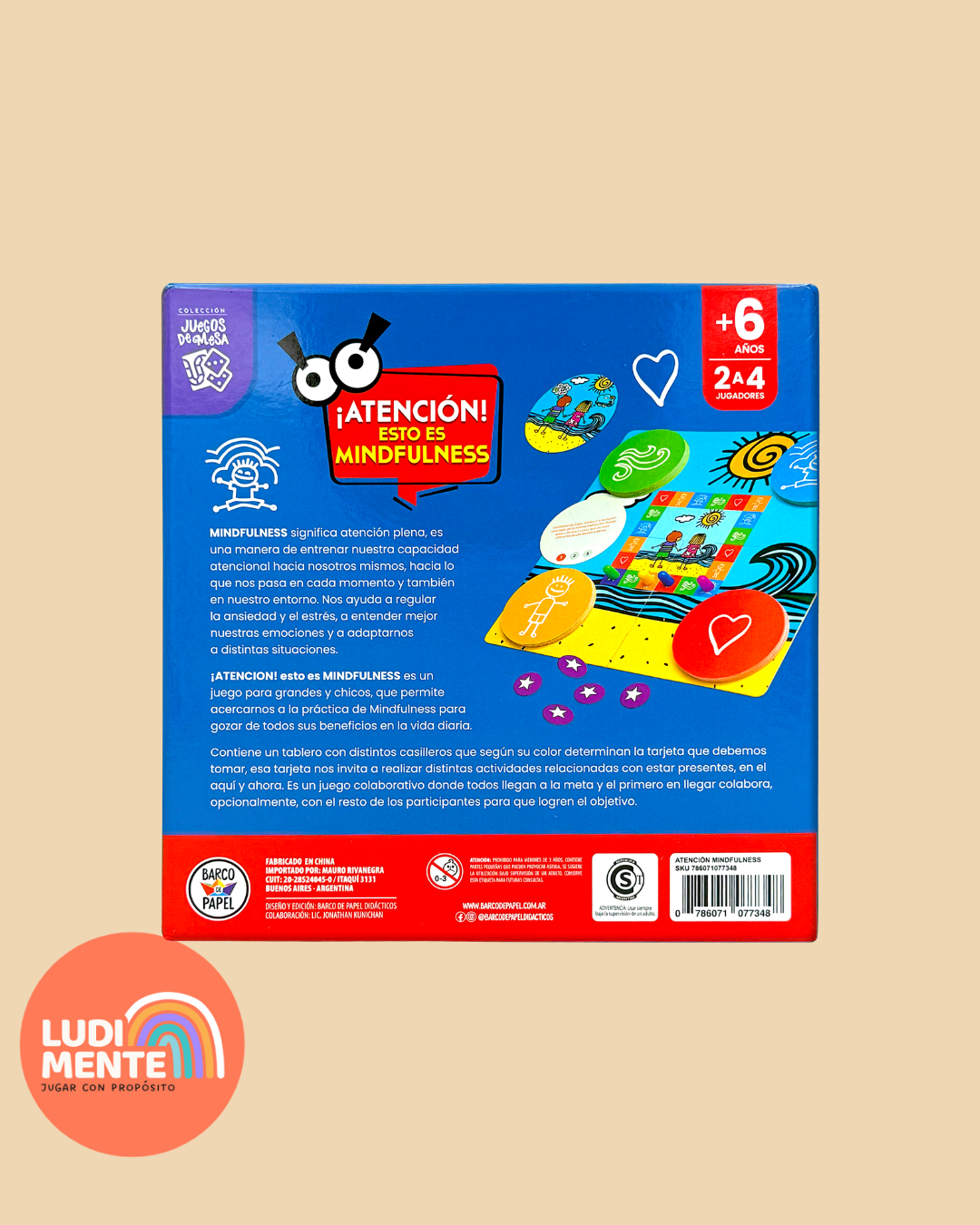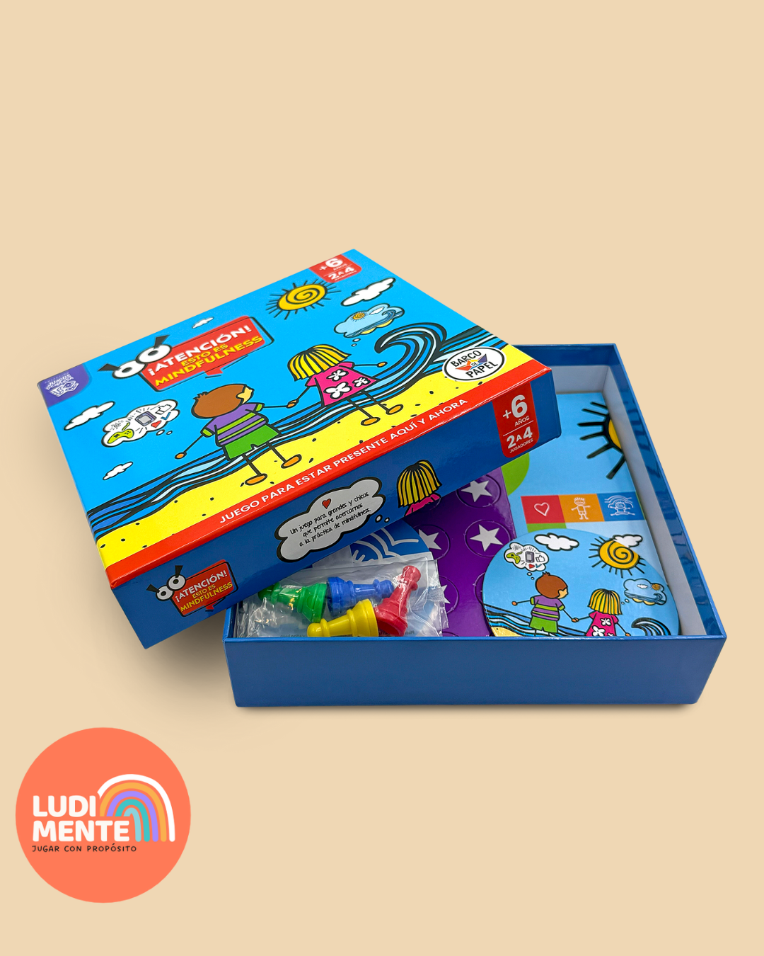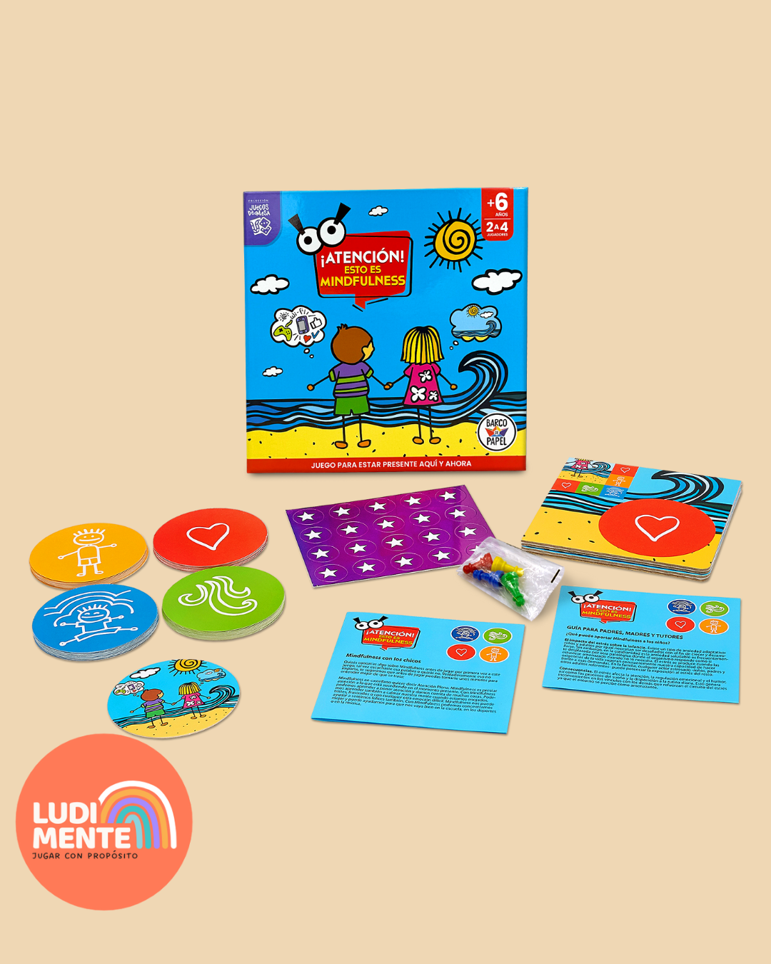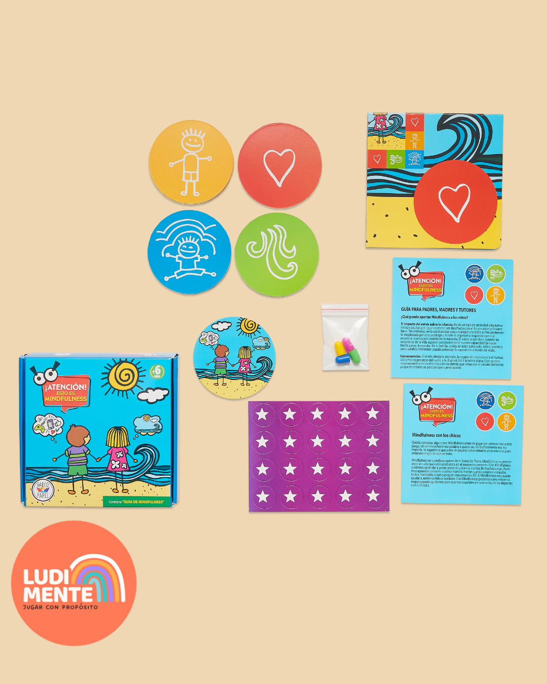 Contenido: 1 tablero, 60 tarjetas, 4 fichas, 1 medalla, fichas estrella, instructivo + guÃa de mindfulness.