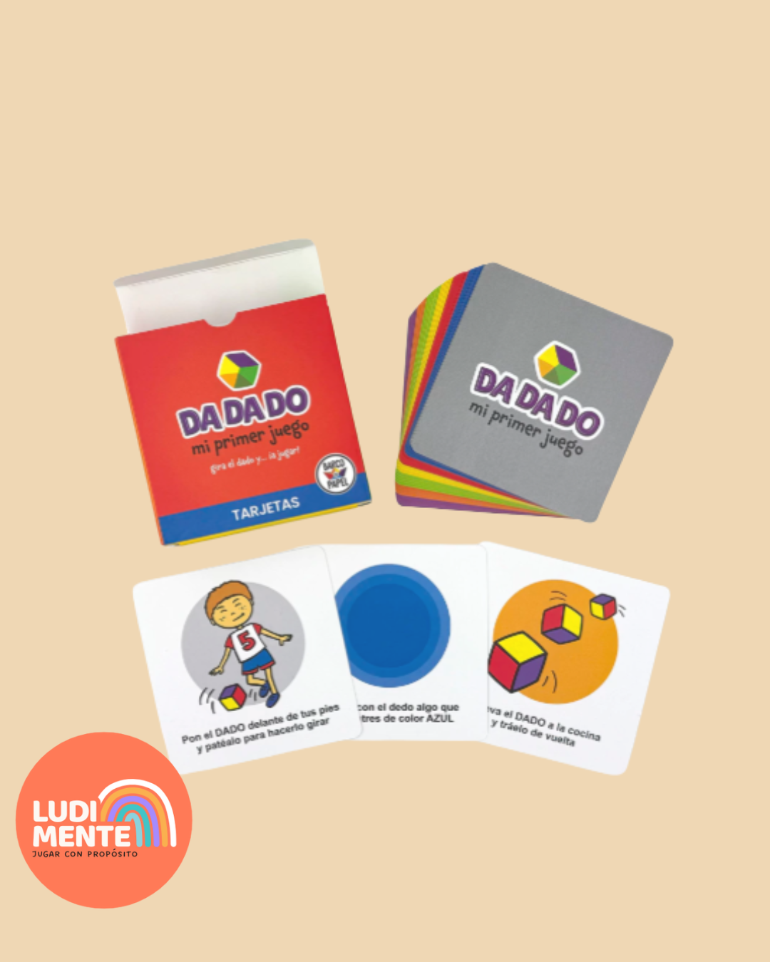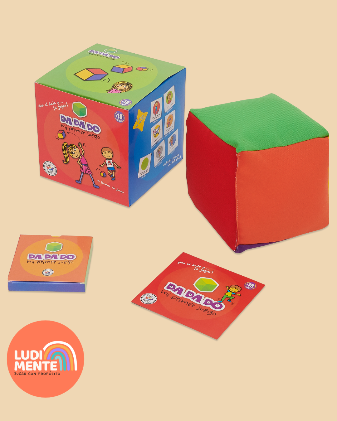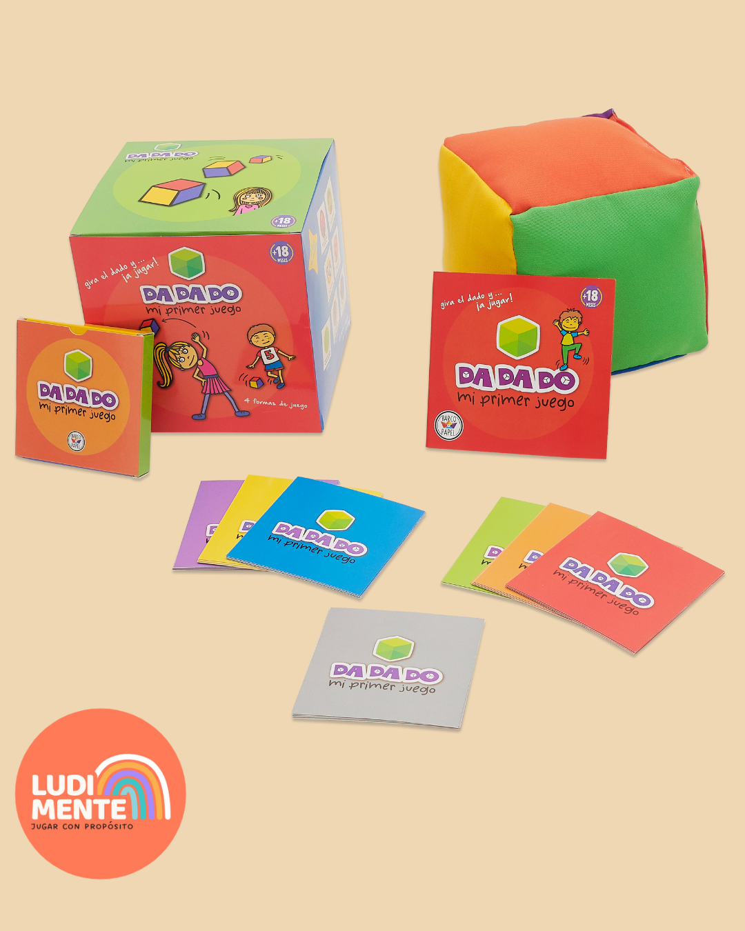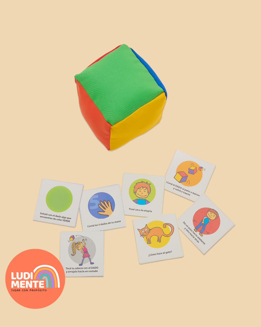 🌈 Incluye un dado gigante, suave y blandito con 6 colores diferentes y un mazo de cartas para cada color.
