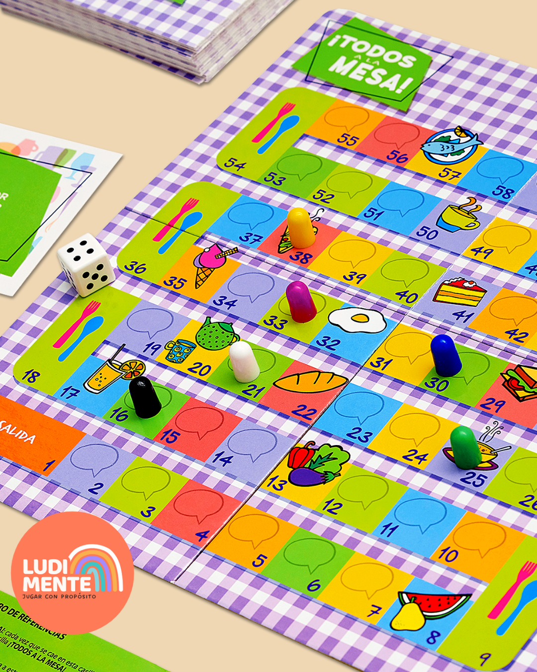 Todos a la mesa es un juego de recorrido que invita a chicos y chicas a expresarse, contar experiencias y conectar con los demás a través de preguntas y consignas simples, divertidas y llenas de posibilidades.
