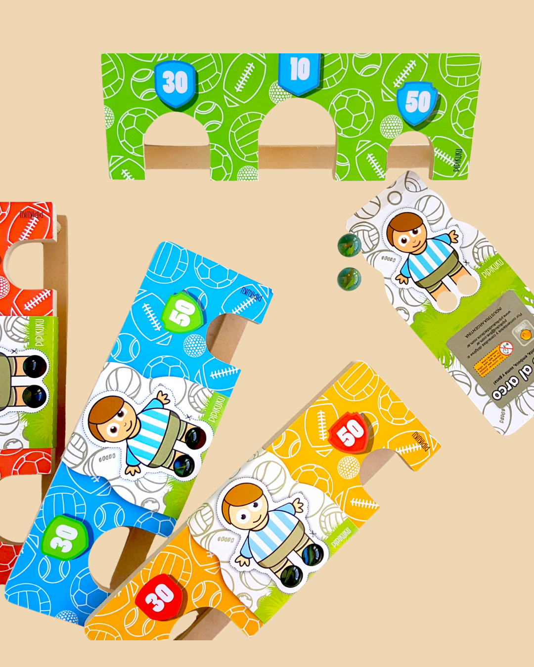 Tiro al arco es un juego educativo que combina el desafío de embocar con el desarrollo del pensamiento matemático. La consigna es simple y atrapante: lanzar las bolitas de vidrio e intentar que entren en los arcos con mayor puntuación.